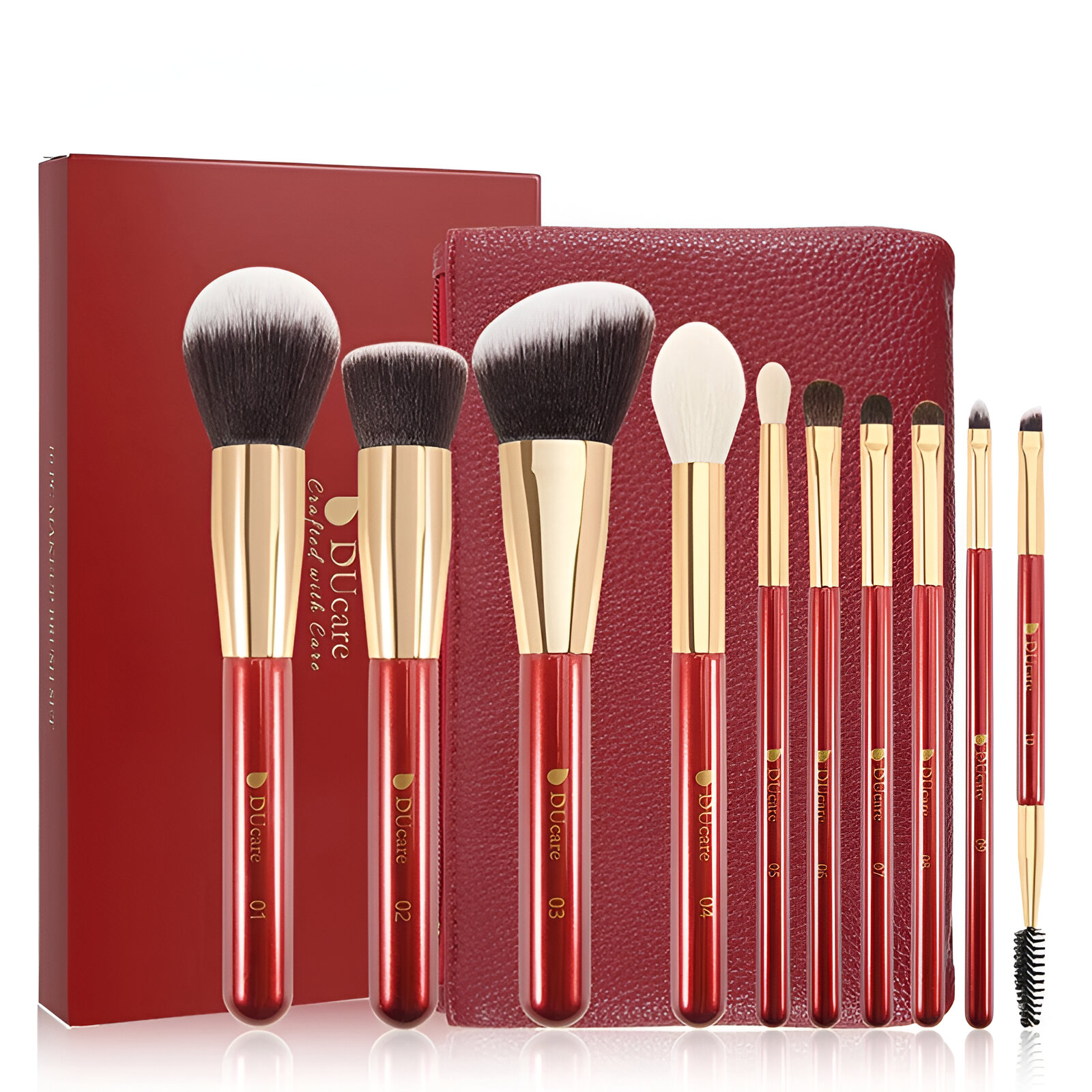 Elevate your beauty regimen with this all-in-one 10-piece makeup brush set. Designed for makeup lovers and professionals alike, this set includes everything you need to create a flawless face and eye look. From powder and foundation to eyeshadow and lip color, these brushes are your go-to tools for blending, contouring, and applying makeup seamlessly. Plus, the high-quality red bag offers a stylish and convenient way to store and carry your brushes wherever you go.