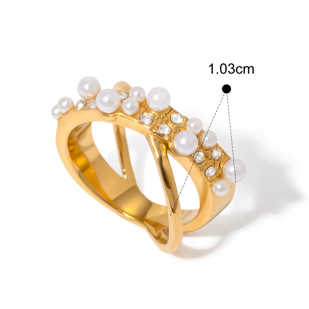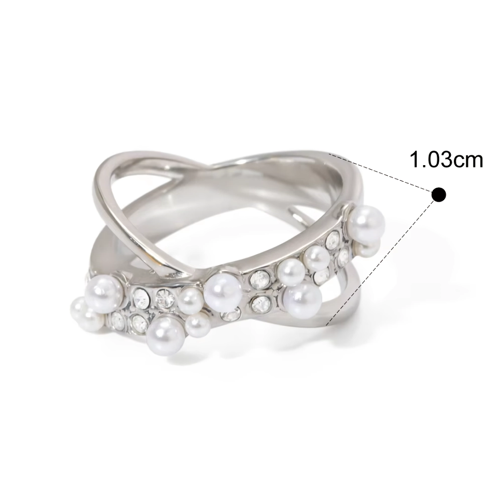 Make a bold yet elegant statement with this stunning 18K gold color stainless steel pearl X-shaped interlocking stackable ring. Designed to be both trendy and versatile, this chic piece combines modern style with timeless beauty, making it a perfect addition to any jewelry collection. Featuring a unique X-shaped design, interwoven with lustrous pearls and sparkling water diamonds, this ring adds the perfect touch of sophistication to any outfit, whether you’re dressing up for a special occasion or enhancing your everyday look.