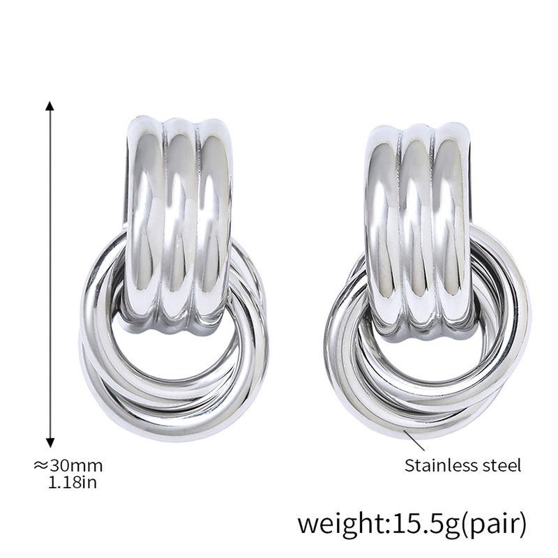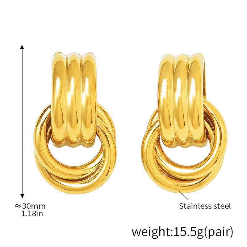 Elevate your jewelry collection with these stylish and durable Stainless Steel Two Circles Dangle Earrings. The modern design, combined with 18K gold plating and waterproof functionality, makes them the perfect accessory for any occasion. Order today and add a chic, sophisticated touch to your wardrobe!