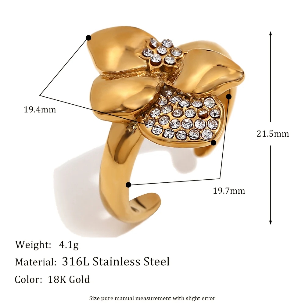 Made from high-quality 316L stainless steel, the Asymmetric Rhinestone Flower Ring boasts superior durability, ensuring it will withstand the test of time without tarnishing. Its gold-plated finish adds a luxurious shine, while the stunning rhinestones on the flower design catch the light from every angle, giving off a dazzling effect. The adjustable opening design ensures a comfortable fit for most finger sizes, making it an ideal gift for yourself or a loved one.