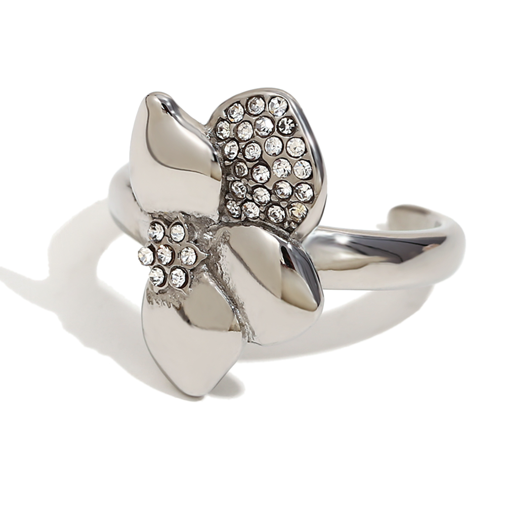 Asymmetric Rhinestone Flower Ring Silver Color Stainless Steel Waterproof Ring for Women