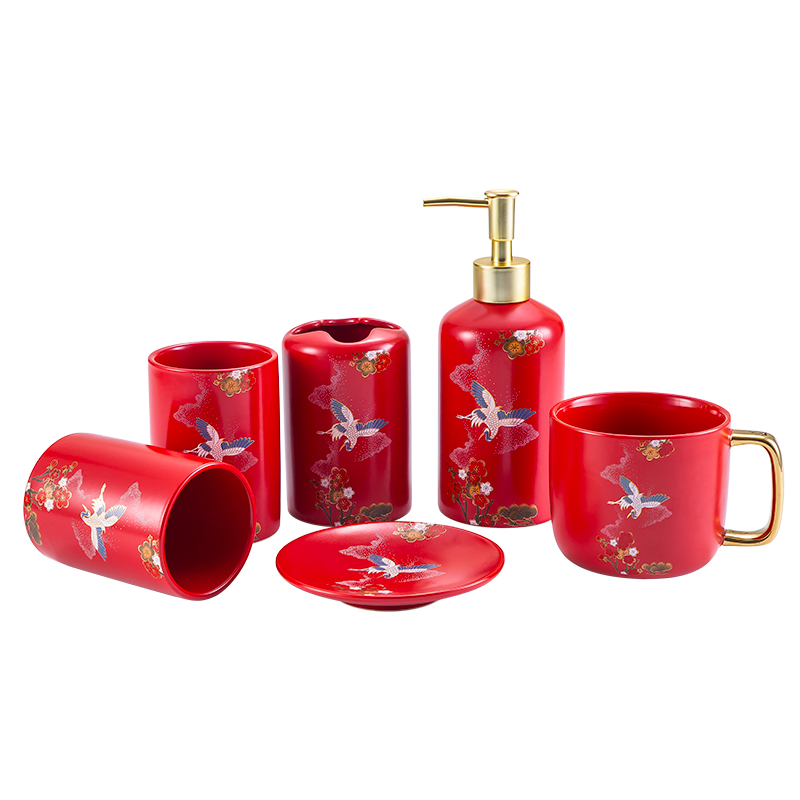 Elegant Crane Painted Ceramic Bathroom Accessories Set. This exquisite five-piece collection features stunning crane artwork that embodies elegance and tranquility, creating a serene atmosphere in your home. Made from high-quality ceramic, this set is not just functional; it’s a piece of art that enhances the overall charm of your bathroom.