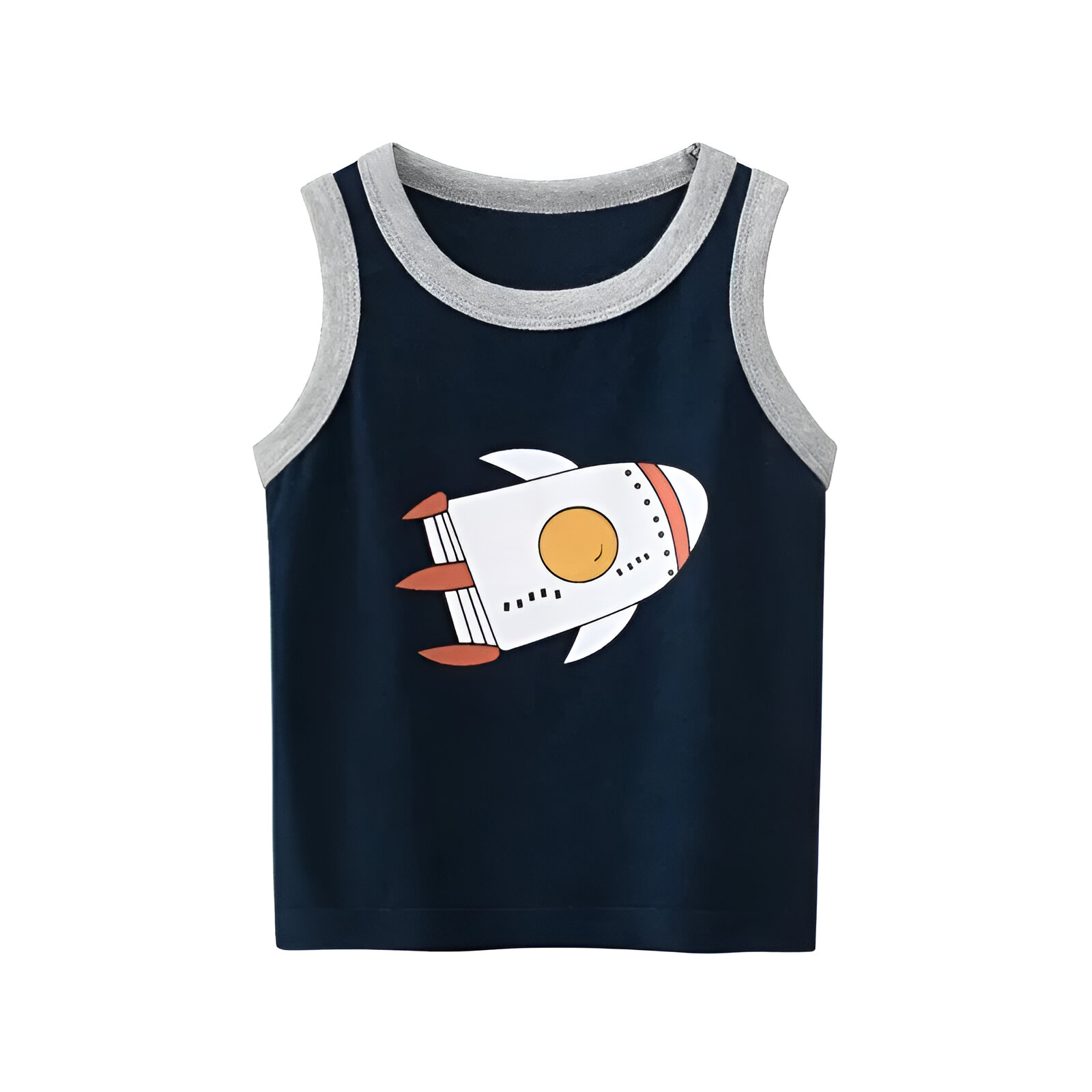 This Rocket Print Vest is more than just a summer top. It combines comfort, style, and practicality in one amazing piece of clothing. Whether your child is running around in the backyard, enjoying a family outing, or just hanging out, this sleeveless tee will keep them cool, comfy, and looking great. The rocket print brings an element of fun and creativity, making it a go-to for kids who love space-themed designs.